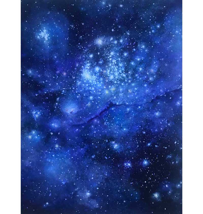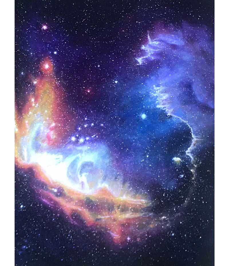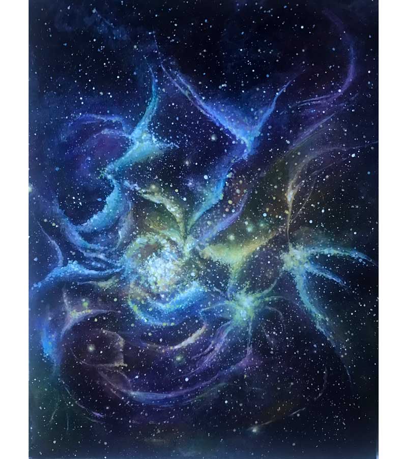 Since learning a glazing technique, it has been my favorite way of painting, especially for cosmic worlds and pattern paintings. Applying 10 to 20 thin, transparent layers creates satisfying luminosity and vibrancy. Its a painstaking process in oil, but I love it for its deep transparent effect.