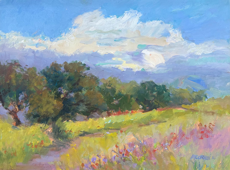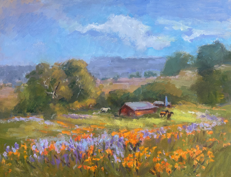 Painting for me involves the whole experience of being within a peaceful environment. I delight in the subtleties the seasons impose on California's mountains; in the variations of golden hues in the rolling hills. My most recent challenge has been to enjoy painting pure landscape with only the hint of human presence. I seek to encompass the viewer with my insights of the changing landscape.